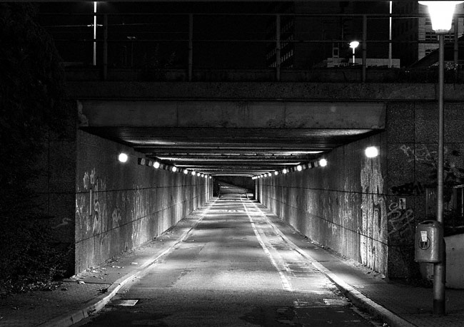 Das Foto zeigt eine einsame Unterführung in der Nähe des Bahnhofes in schwarz-weiss bei später Stunde. Ein städtischer Abfallbehälter hängt an einem Strassenlaternenmast.